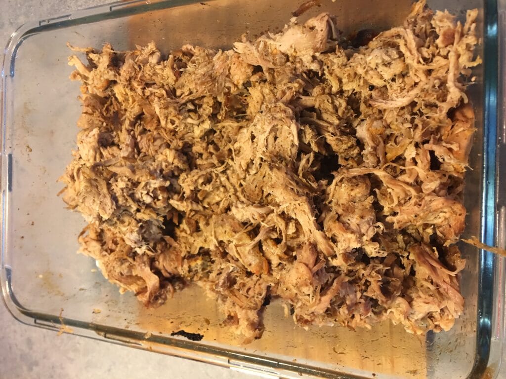 Slutteligt tager du kødet ud af ovnen og trækker det (yderligere) fra hinanden med et par gafler.